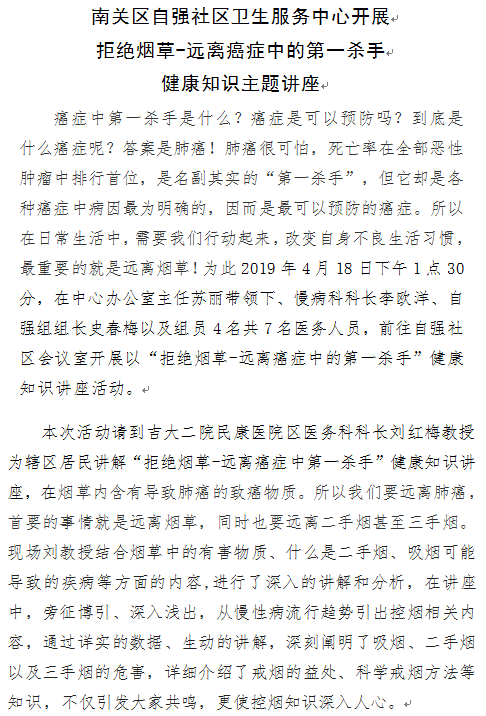 南关区自强社区卫生服务中心开展 拒绝烟草-远离癌症中的第一杀手 健康知识主题讲座