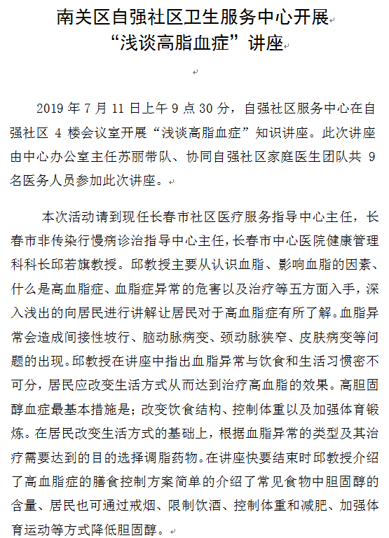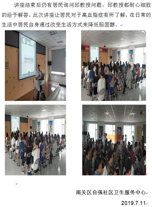 南关区自强社区卫生服务中心开展 “浅谈高脂血症”讲座